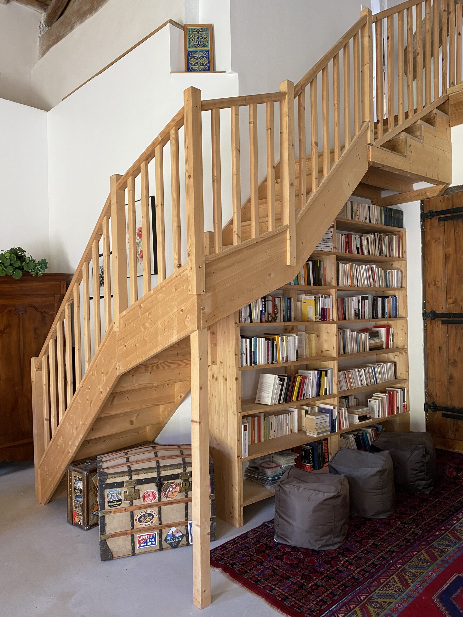 Différents espaces sont accessibles : salon, détente, bibliothèque, grande table et, à l’extérieur : terrasse avec table et chaises, chaise-longues, bancs à différents endroits du parc et de la forêt.