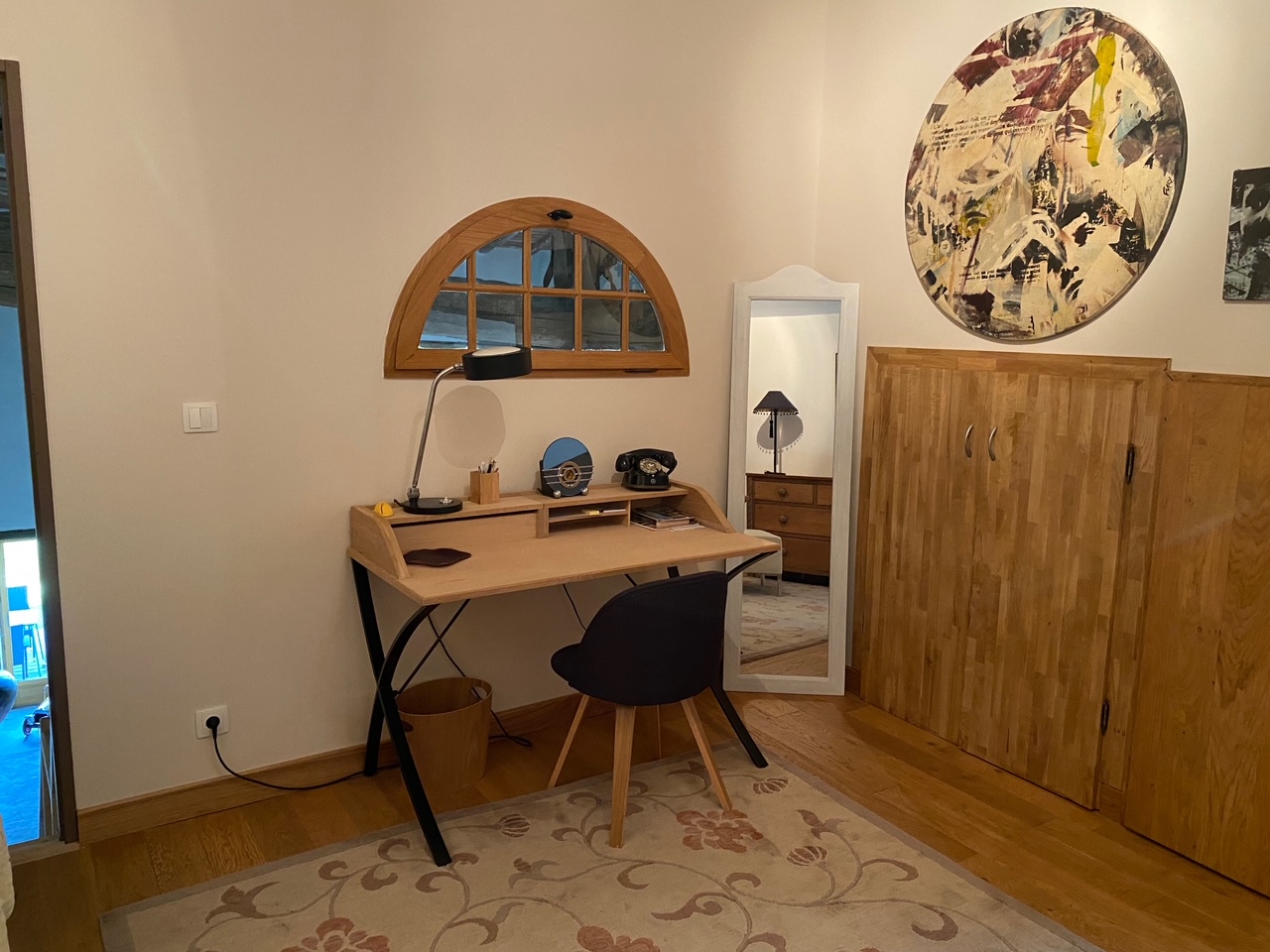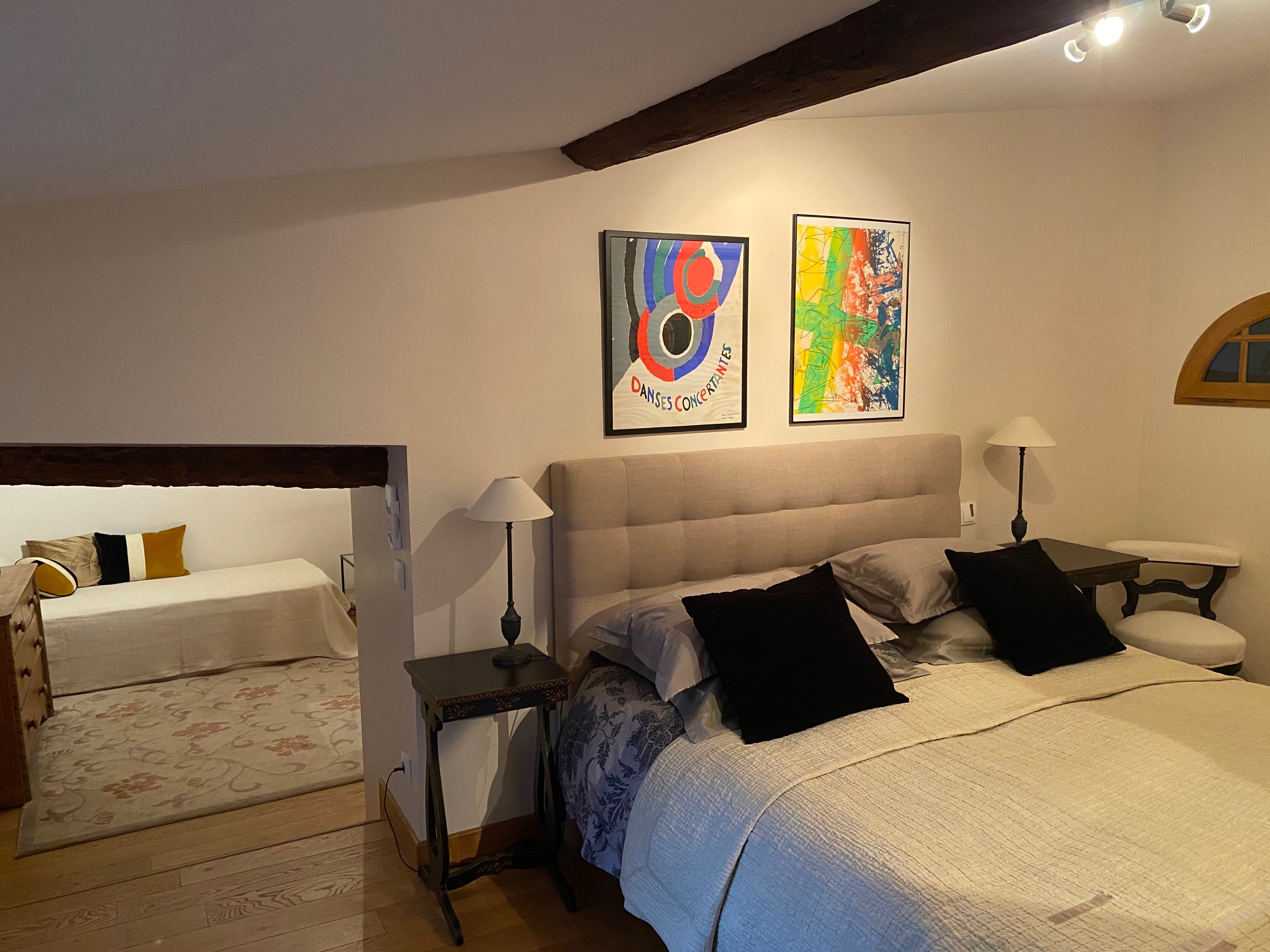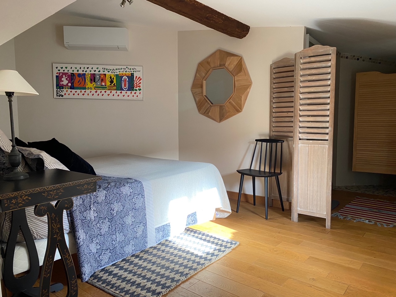 Cette suite est aménagée à l’étage du bâtiment XVIIIe. Elle comprend une première pièce salon/bureau et la seconde pièce est la chambre avec un lit queen-size, fenêtre sur la cour intérieure. La salle de bain, douche, toilette est attenante à la chambre. La chambre dispose de la climatisation. La décoration est contemporaine, le parquet est en chêne. La surface est de 27 m². C’est l’endroit idéal pour se reposer, silence et confort sont au rendez-vous.